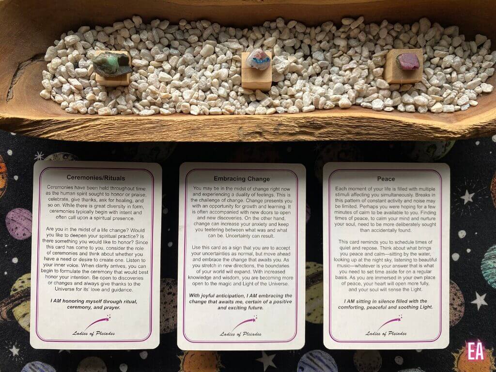 Are you in the midst of a life change? Would you like to deepen your spiritual practice? Is there something you would like to honor? Since this card has come to you, consider the role of ceremonies and think about whether you have a need or desire to create one. Listen to your inner voice. When clarity arrives, you can begin to formulate the ceremony that would best honor your intention. Be open to discoveries or changes and always give thanks to the Universe for its’ love and guidance.